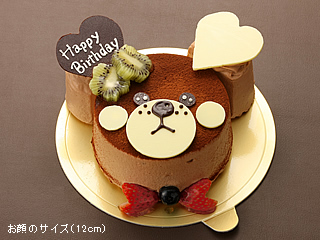 ココアスポンジと生チョコクリームを使用し、くまさんを可愛らしくあつらえました。中のサンドは苺です。